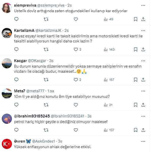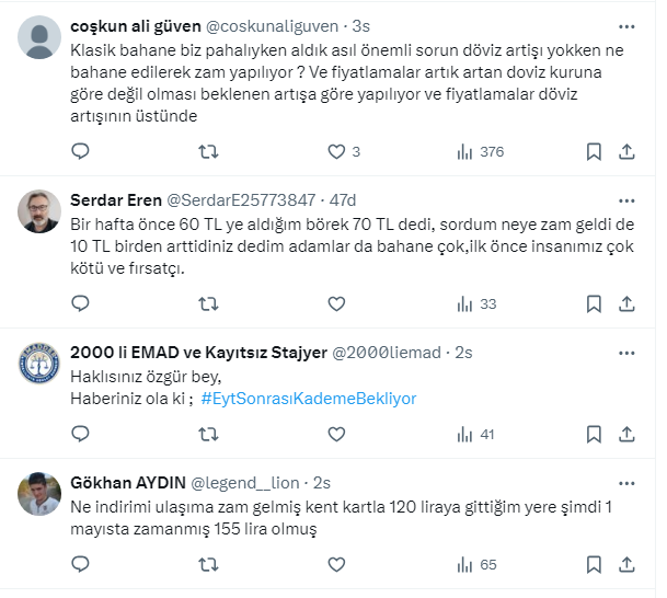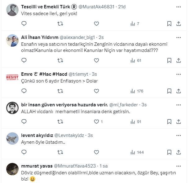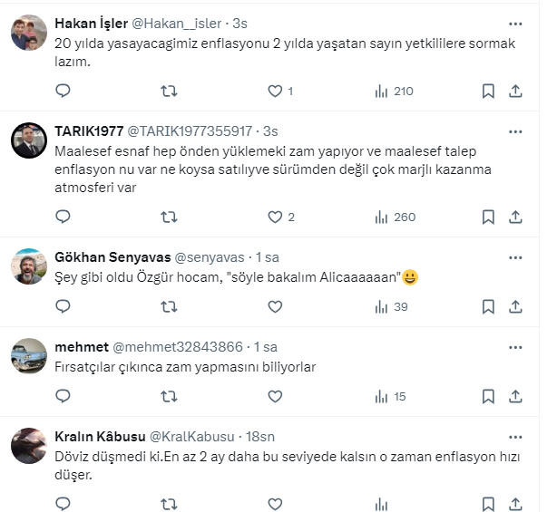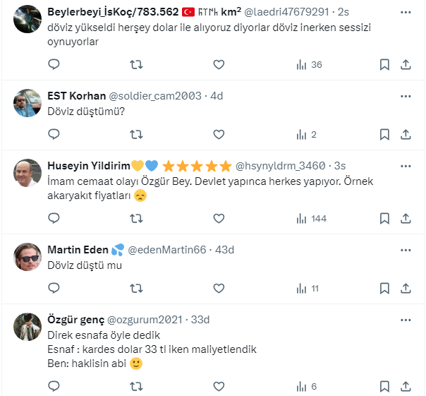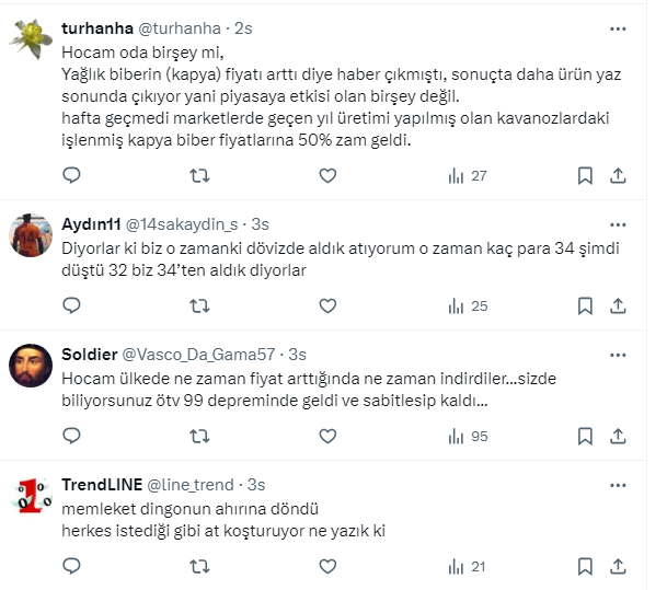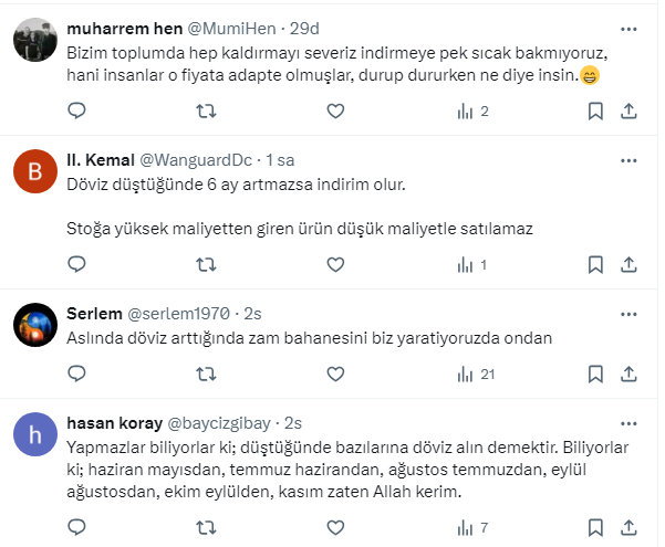 Ekonomi yönetimi tarafından alınan tedbirlere rağmen zamlar durmuyor. SGK uzmanı Özgür Erdursun, sosyal medya hesabından, ”Döviz arttığında anında ürünlerine zam yapanlar döviz düştüğünde neden indirim yapmıyor” diye sordu. Vatandaş cevapladı.