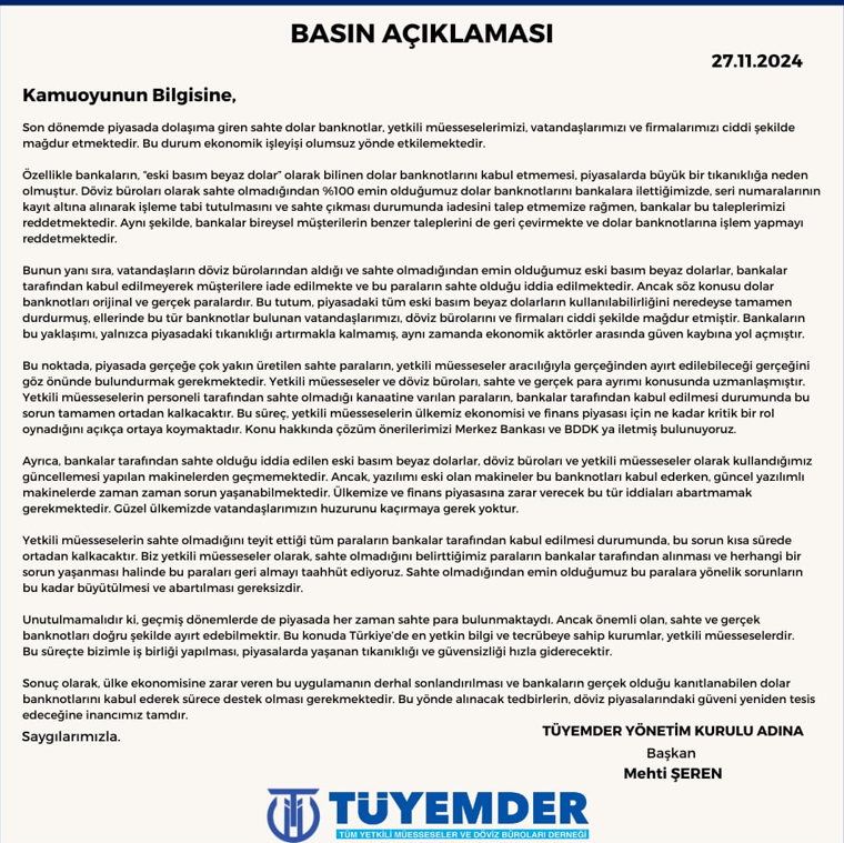 Türkiye'de sahte dolarların piyasaya sürülmesi başta ekonomi, ticaret dünyası ile binlerce yatırımcıyı endişeye sürükledi. Para sayma makinelerinde bile tespit edilemeyen bu sahte dolarlar yaygınlaşırken, bankalar geçici olarak dolar almamaya kararı verdi. Vatandaşların bu konuyla ilgili mağdur olduklarını belirten Tüyemder Başkanı Mehti Şeren'den basın açıklaması geldi. Şeren, sahte dolara karşı, bankaları iş birliğine çağırdı. İşte Tüm Yetkili Müesseseler ve Döviz Büroları Derneği'nden gelen o basın açıklaması...