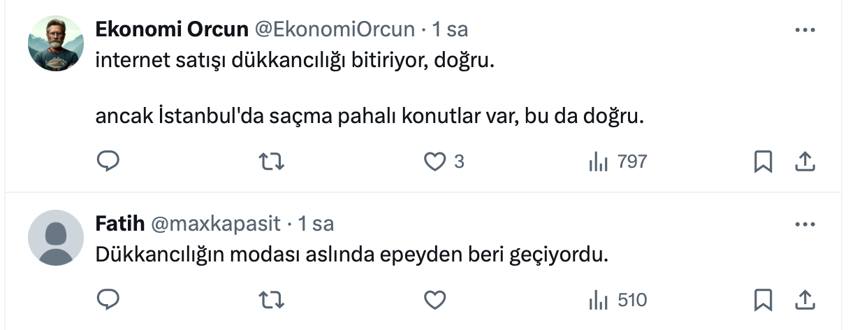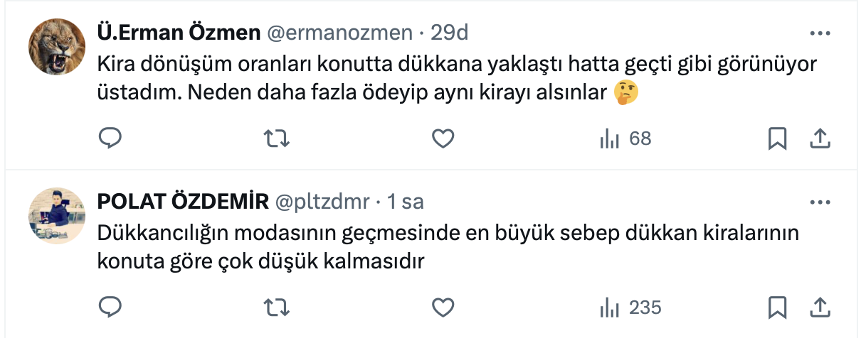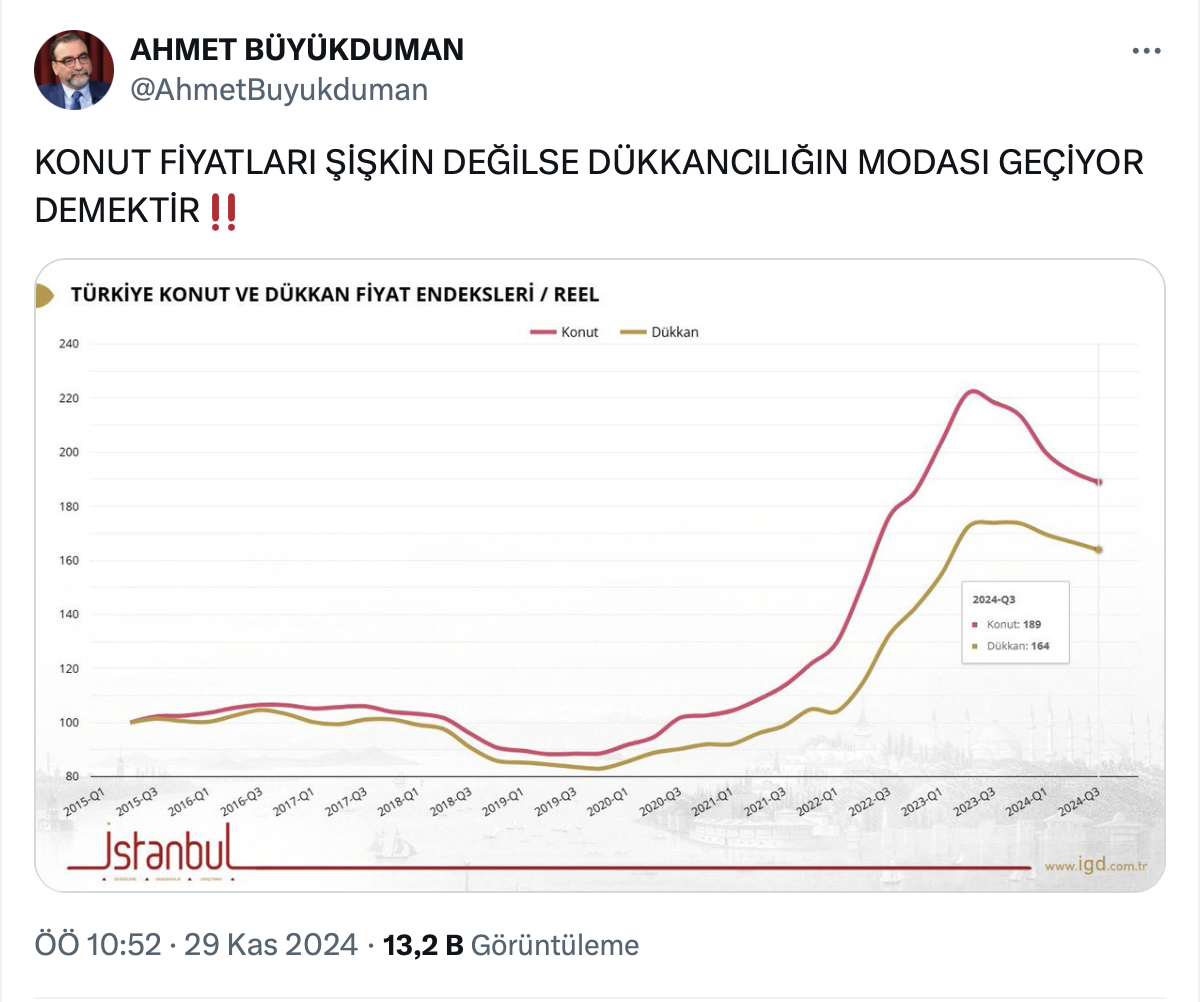 Ahmet Büyükduman paylaşımda “Konut fiyatları şişkin değilse dükkancılığın modası geçiyor demektir” ifadelerini kullandı.