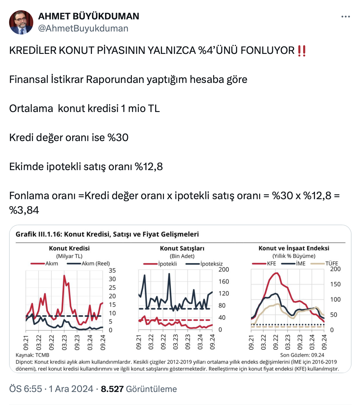 Ahmet Büyükduman paylaşımında kredilerin konut piyasasının yalnızca yüzde 4’ünü fonladığını belirtti.