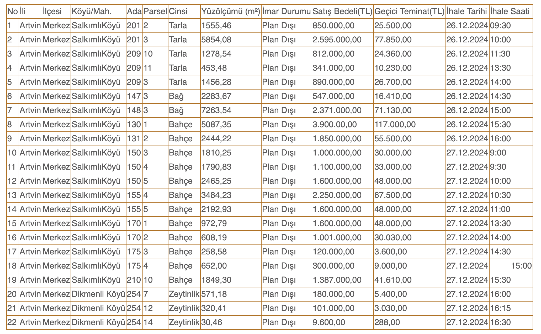 Artvin Merkez’de yer alan arazi, bağ, bahçe ve zeytinliklerin yüz ölçümleri 30,46 metrekare ile 5 bin 854,08 metrekare arasında değişiyor.