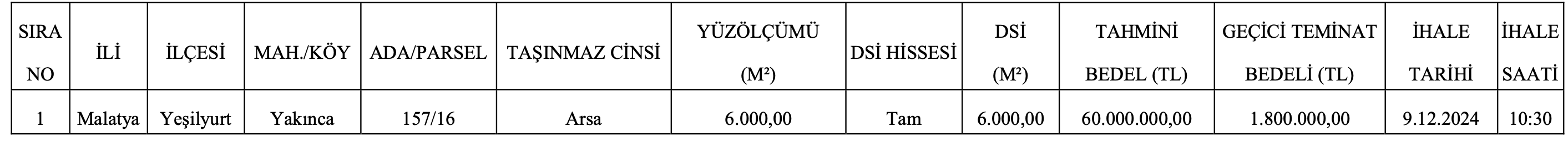 Arsanın satış ihalesi 9 Aralık 2024 tarihinde saat 10.30’da Malatya DSİ 92. Şube Müdürlüğü’nde yapılacak.