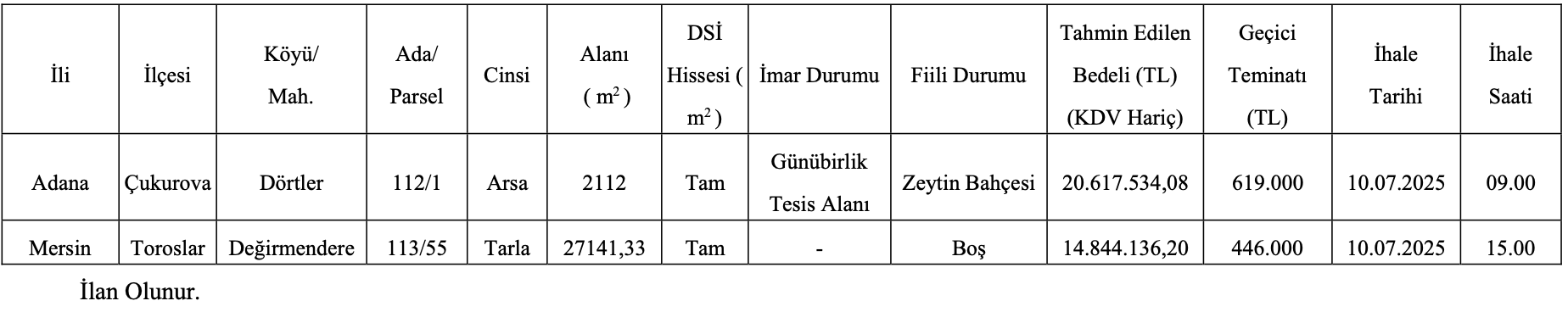 Devlet Su İşleri Genel Müdürlüğü 6. Bölge Müdürlüğü, Adana ve Mersin’de yer alan arsa ve arazileri satışa çıkardı. Arsa ve arazilerin satış ihalesi 10 Temmuz 2025 tarihinde gerçekleştirilecek.