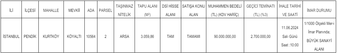 İstanbul Pendik Kurtköy'de yer alan arsanın muhammen bedeli 90 milyon TL, geçici teminat bedeli ise 2 milyon 700 bin TL olarak açıklandı. 3 bin 59 metrekare alana sahip arsanın satış ihalesi 11 Haziran 2024 tarihinde yapılacak.