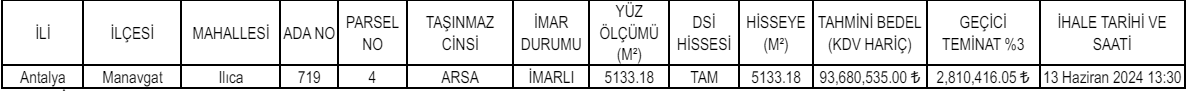Antalya Manavgat Ilıca'da yer alan imarlı arsanın ise muhammen bedeli 93 milyon 680 bin 535 TL geçici teminat bedeli ise 2 milyon 810 bin 416 TL olarak açıklandı.