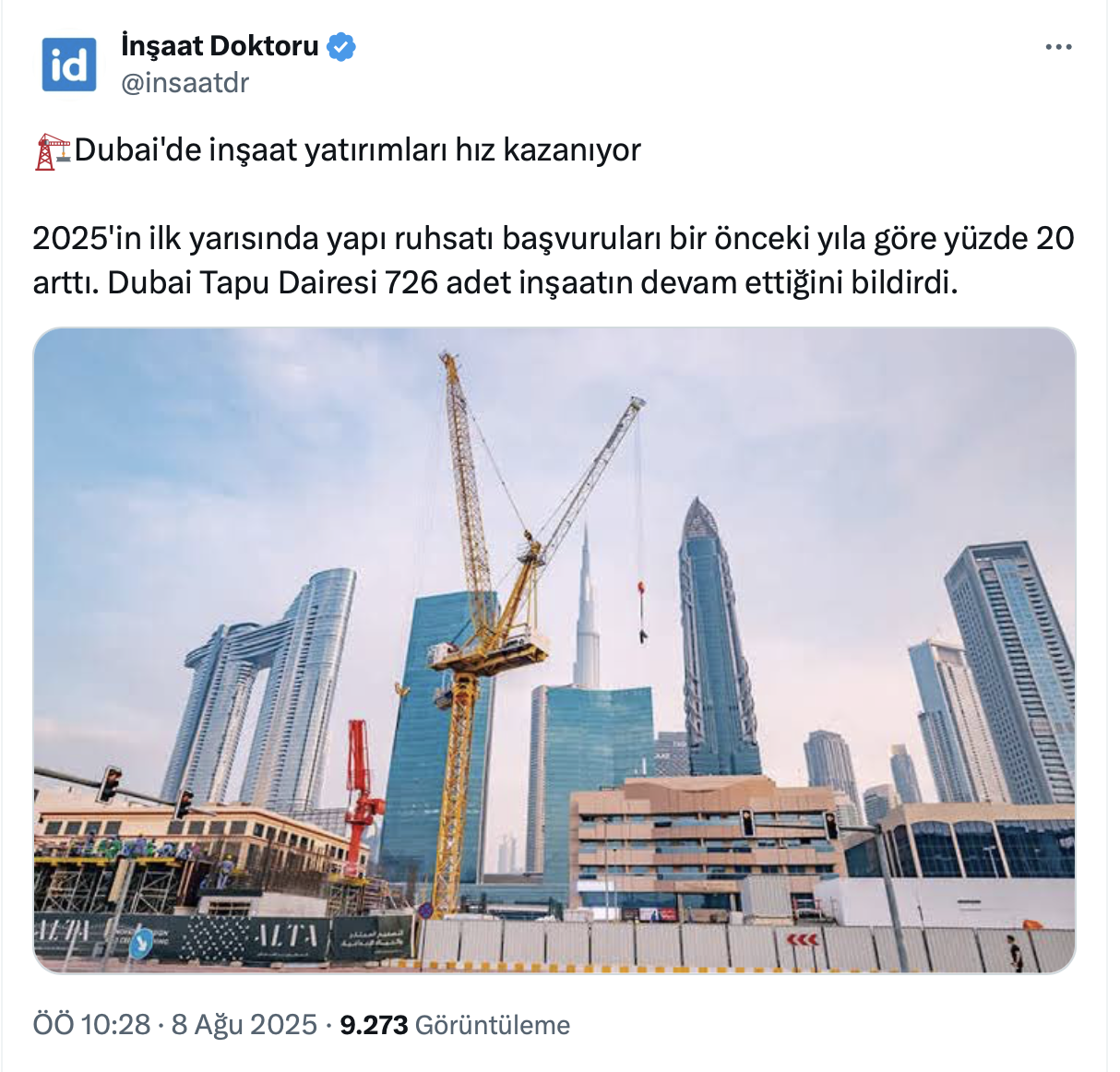 İnşaat ve konut sektörü ile ilgili yaptığı paylaşımlarına hız kesmeden devam eden 55,7 bin takipçili İnşaat Doktoru resmi X hesabı https://twitter.com/insaatdr üzerinden bu kez de Dubai emlak piyasası ile ilgili bir paylaşım yaptı.