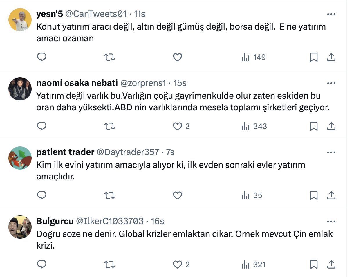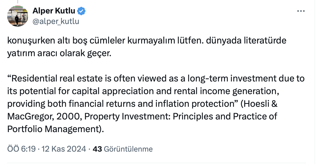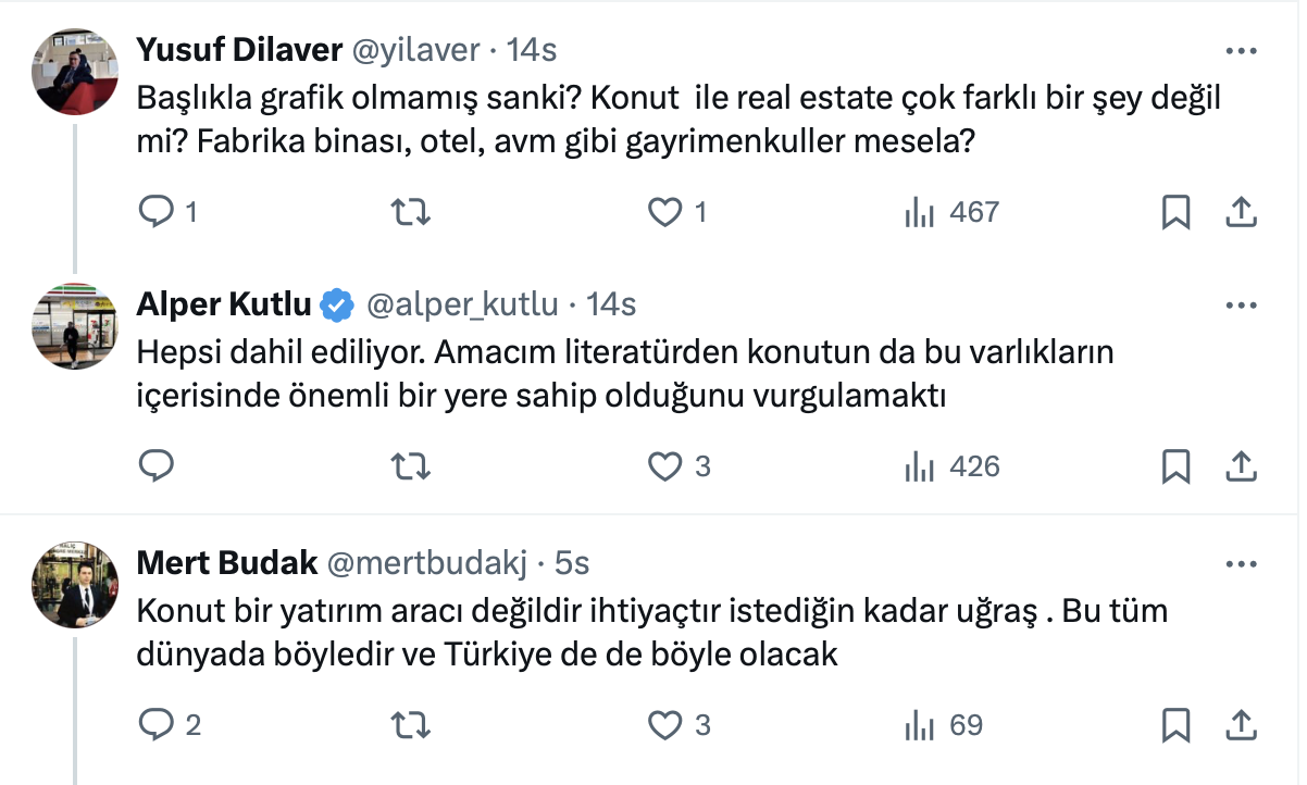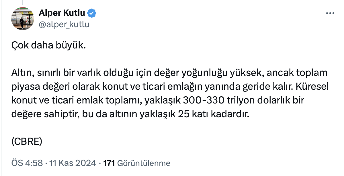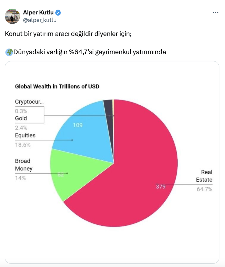 Konutun bir yatırım aracı olup olmadığı tartışmaları hız kesmeden devam ederken, İnşaat Mühendisi Alper Kutlu’nun resmi sosyal medya hesabı https://x.com/alper_kutlu üzerinden yaptığı paylaşıma göre dünyadaki varlığın yüzde 64,7’si gayrimenkul yatırımında.
