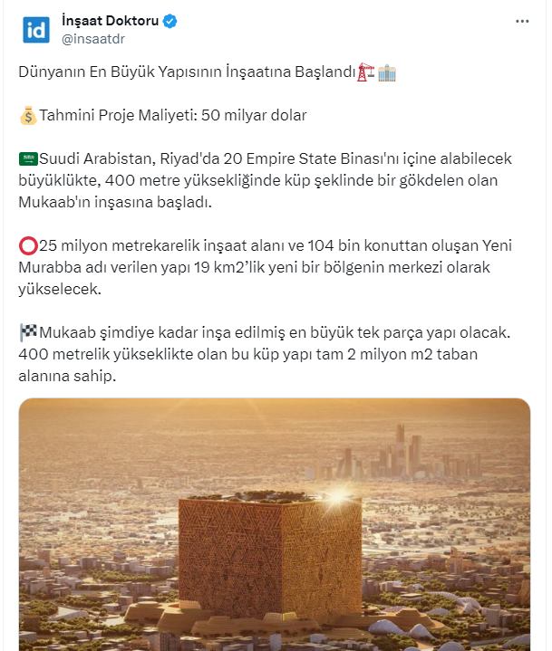 Suudi Arabistan, Riyad'da 20 Empire State Binası'nı içine alabilecek büyüklükte, 400 metre yüksekliğinde küp şeklinde bir gökdelen olan Mukaab'ın inşasına başladı.