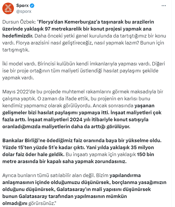 Dursun Özbek, Florya projesiyle ilgili İstanbul'daki Lütfi Kırdar Uluslararası Kongre ve Sergi Sarayı'nda yapılan genel kurul toplantısında önemli açıklamalarda bulundu. Sporx, Özbek'in açıklamasını sosyal medya hesabı X'ten paylaştı.. İşte o açıklama...