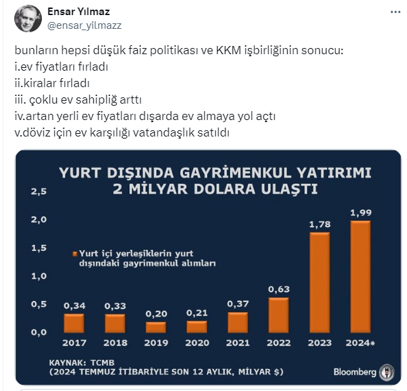 Ekonomist Ensar Yılmaz sosyal medyadan konut piyasasındaki son durumu değerlendirerek çarpıcı açıklamalarda bulundu. Yılmaz, konut piyasasında şu anda; .ev fiyatlarının ve kiraların fırladığını, çoklu ev sahipliğinin arttığını, artan fiyatalrdan dolayı yerlilerin dışardan ev almaya yol açtığını ve döviz için ev karşılığı vatandaşlık satıldığını söyledi.