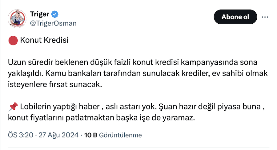 Lobilerin yaptığı haber , aslı astarı yok. Şu an hazır değil piyasa buna, konut fiyatlarını patlatmaktan başka işe de yaramaz.
