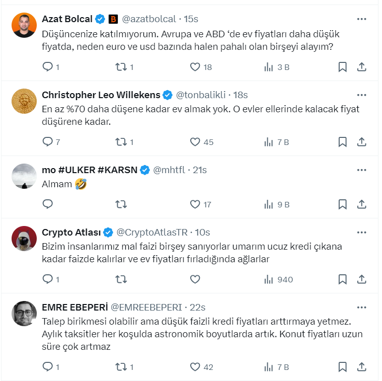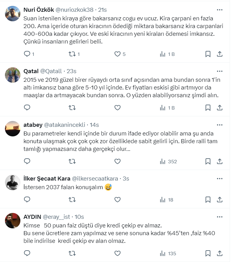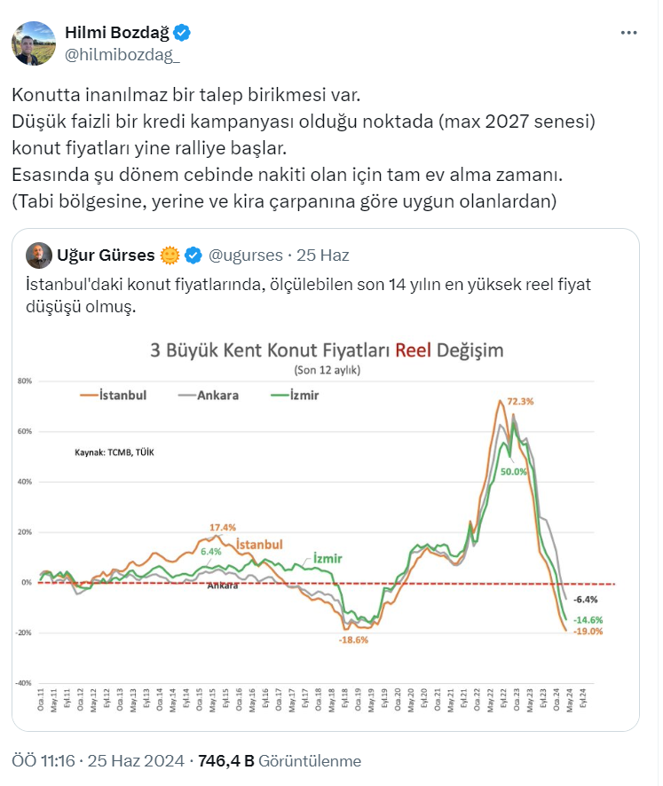 İstanbul'daki konut fiyatlarında, ölçülebilen son 14 yılın en yüksek reel fiyat düşüşü görülürken 12,6 bin takipçili Hilmi Bozdağ yaptığı paylaşımda konutta talep birikmesi olduğunu söyleyerek, düşük faizli kredi kampanyası olduğu noktada konut fiyatlarının yine ralliye başlayacağını belirtti.
