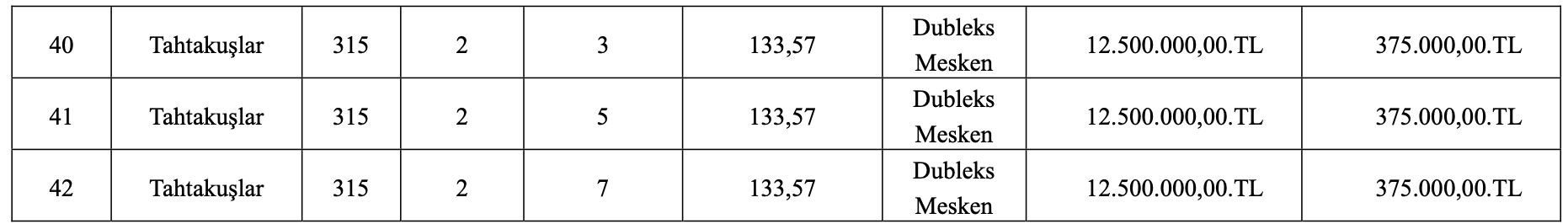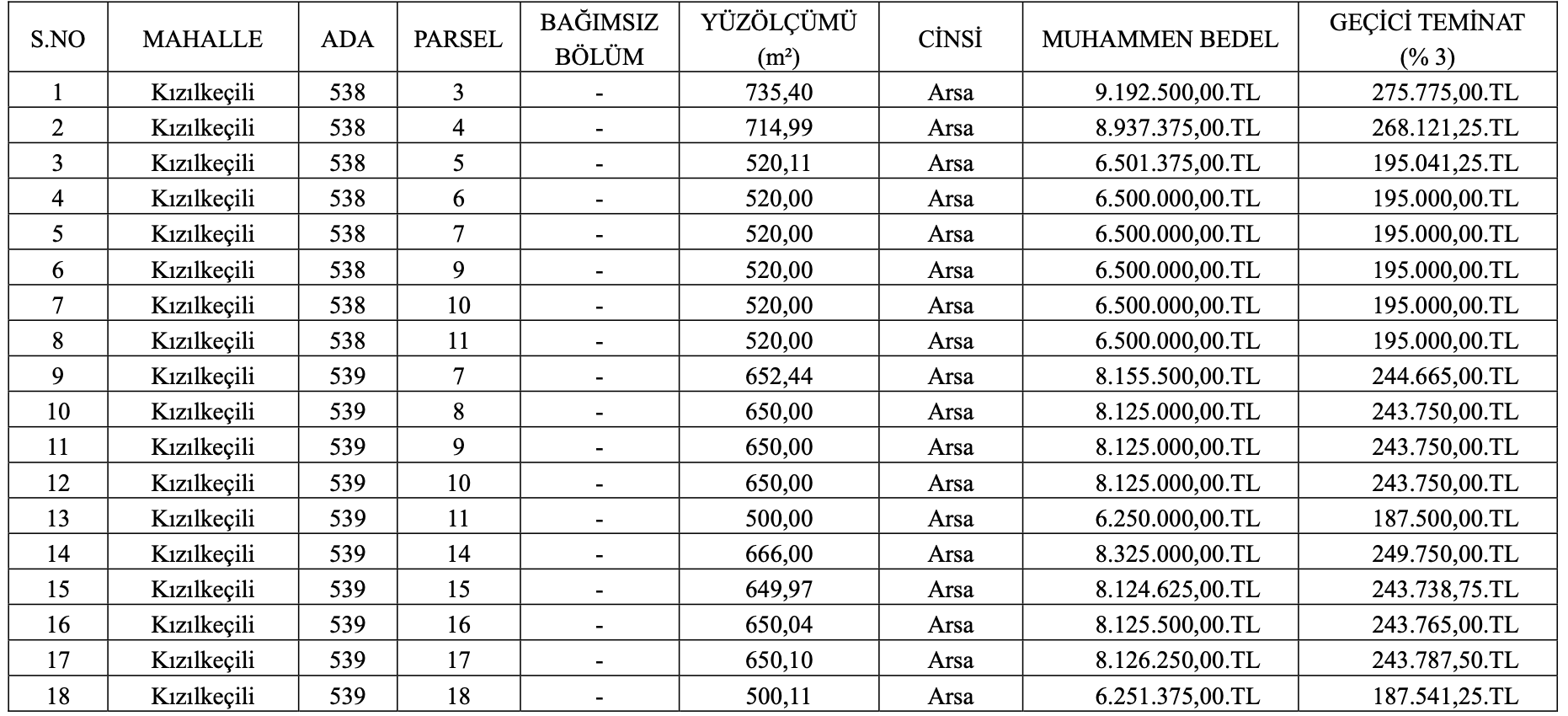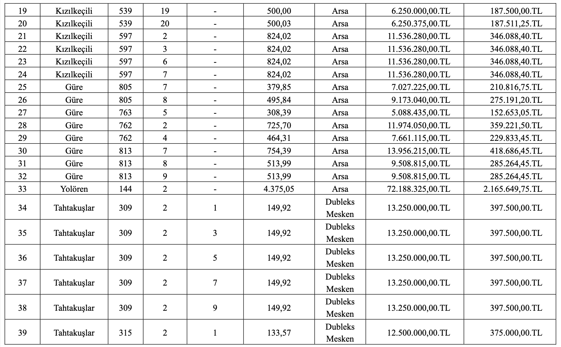 Söz konusu arsa ve konutların muhammen bedelleri 13 milyon 250 bin TL ile 5 milyon 88 bin 435 TL arasında farklılık gösterirken, geçici teminat bedelleri ise 397 bin 500 TL ile 152 bin 653,05 TL arasında değişiyor.