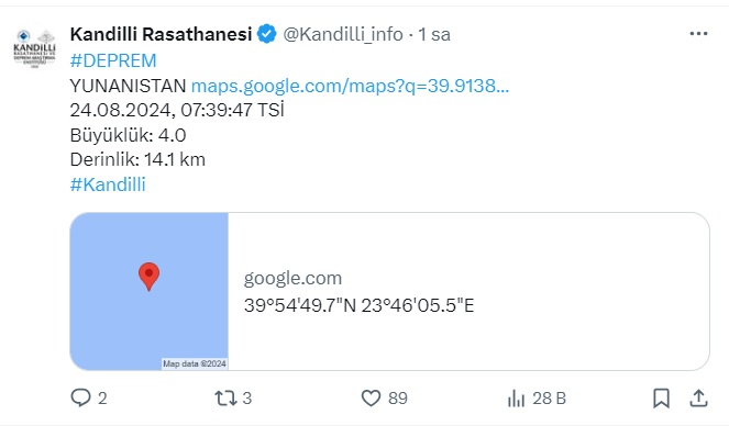 Kandilli Rasathanesi ise depremin merkez üssünü Yunanistan olarak açıkladı. Depremin büyüklüğünü 4.0 olarak duyurdu.