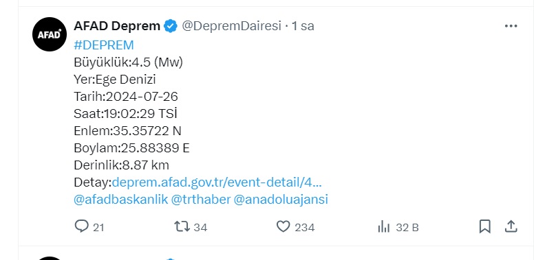 AFAD, Ege Denizi açıklarında 4,5 büyüklüğünde deprem olduğunu duyurdu. Yapılan açıklama kapsamında depremin 8,8 kilometre derinlikte meydana geldiği belirtildi.