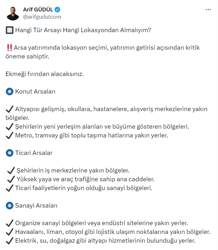Arif Güdül resmi sosyal medya hesabı üzerinden yaptığı paylaşımda 'Ekmeği fırından alacaksınız' diyerek, hangi tür arsanın hangi lokasyondan alınması gerektiğini açıkladı!