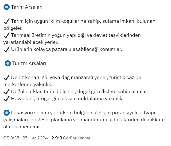 Toprak Yatırımcısı ve talepbul'un Yönetim Kurulu Başkanı Arif Güdül, resmi sosyal medya hesabı üzerinden yaptığı paylaşımda hangi tür arsanın hangi lokasyondan alınması gerektiğini açıkladı.