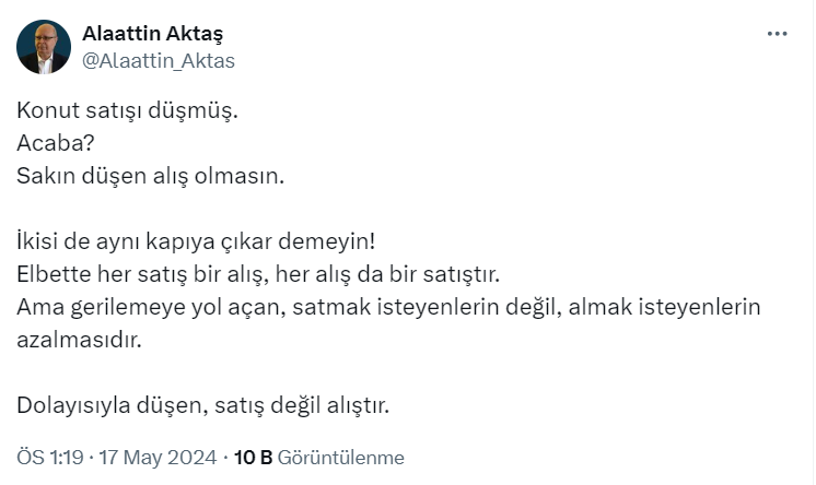 Ekonomim yazarı Alaattin Aktaş https://x.com/Alaattin_Aktas üzerinden yaptığı paylaşımda "Konut satışı düşmüş. Acaba? Sakın düşen alış olmasın." ifadelerini kullandı.