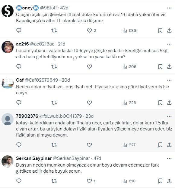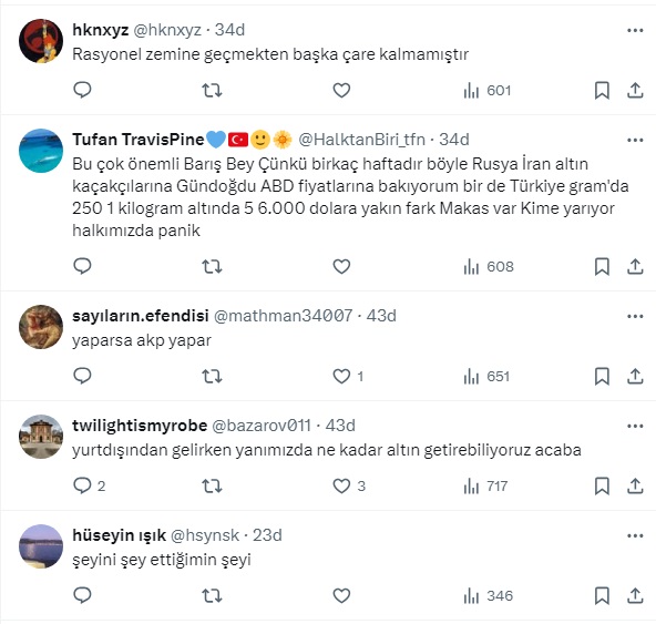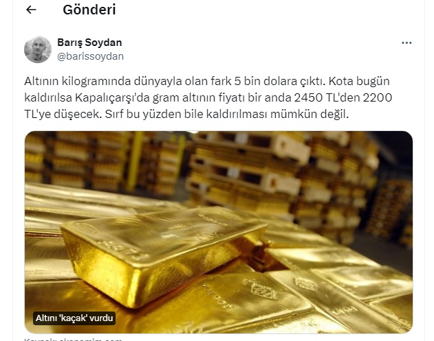 Altın fiyatları yükseliyor. Yatırımcılar altın alıp satarken, Kapalıçarşı altın fiyatlarını takip ediyor. Bugün gram altın Kapalıçarşı'da 2,500 liraya kadar yükseldi. Akşam Fed'in faiz kararı açıklanacak. Karar öncesi altındaki yükselişle ilgili kritik açıklama yapan Barış Soydan kotaya değindi. Soydan, altının kilogram fiyatı dünyayla 5 bin dolar fark olduğunu söyleyen Soydan kotanın kaldırılması halinde altın fiyatlarının ne kadar olacağını sosyal medya hesabı X'ten açıkladı. İşte Soydan'ın o paylaşımı ve gelen yorumlar...