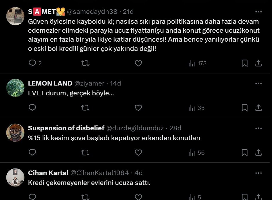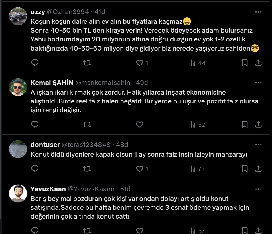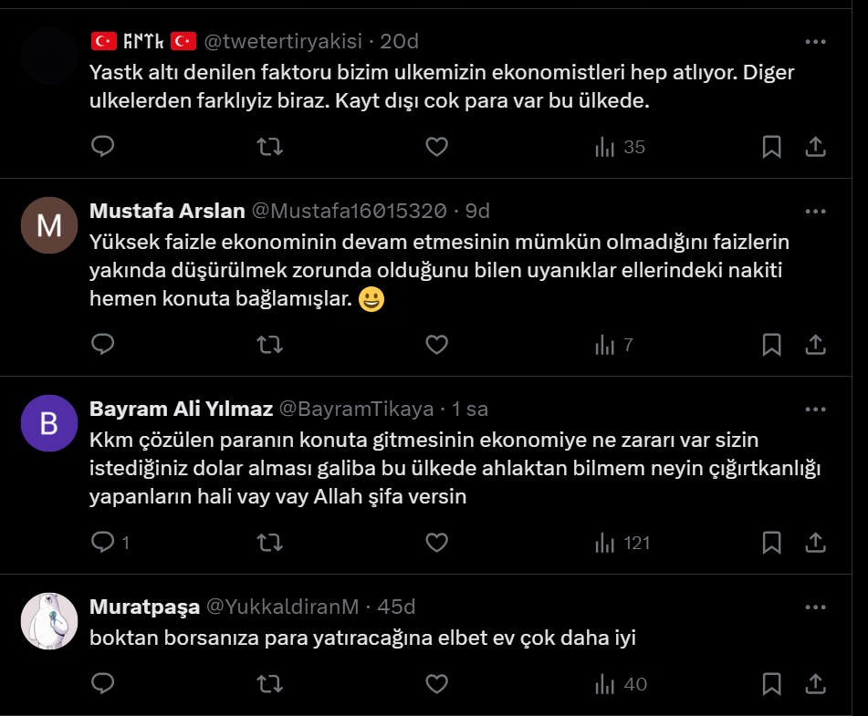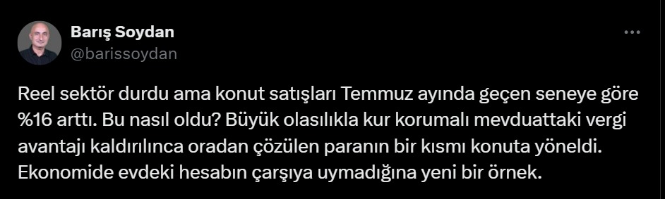 "Reel sektör durdu ama konut satışları Temmuz ayında geçen seneye göre yüzde 16 arttı. Bu nasıl oldu? Büyük olasılıkla kur korumalı mevduattaki vergi avantajı kaldırılınca oradan çözülen paranın bir kısmı konuta yöneldi. Ekonomide evdeki hesabın çarşıya uymadığına yeni bir örnek."