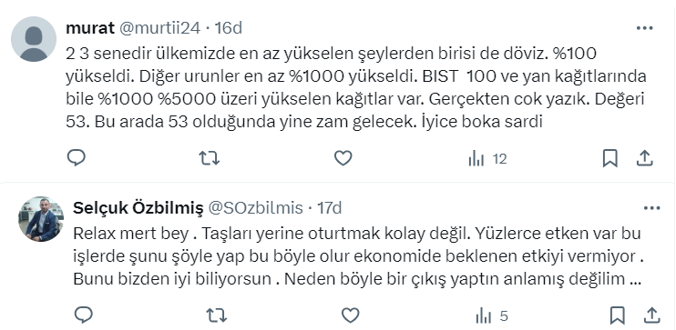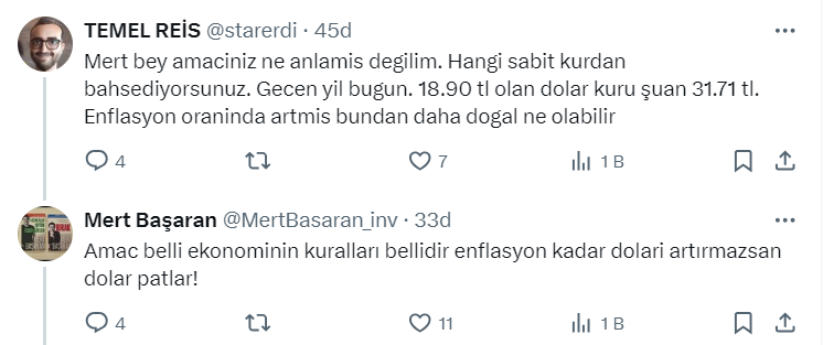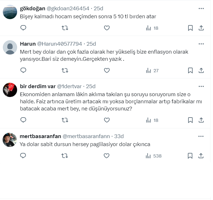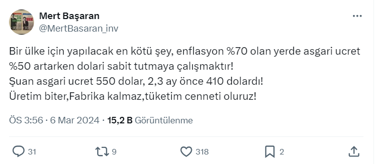 Mert Başaran yaptığı paylaşımda bir ülke için yapılacak en kötü şey, enflasyon yüzde 70 olan yerde asgari ücret yüzde 50 artarken doları sabit tutmaya çalışmak olduğunu belirterek, "Şu an asgari ücret 550 dolar, 2,3 ay önce 410 dolardı! Üretim biter, fabrika kalmaz, tüketim cenneti oluruz!" ifadelerini kullandı.