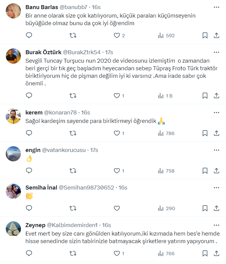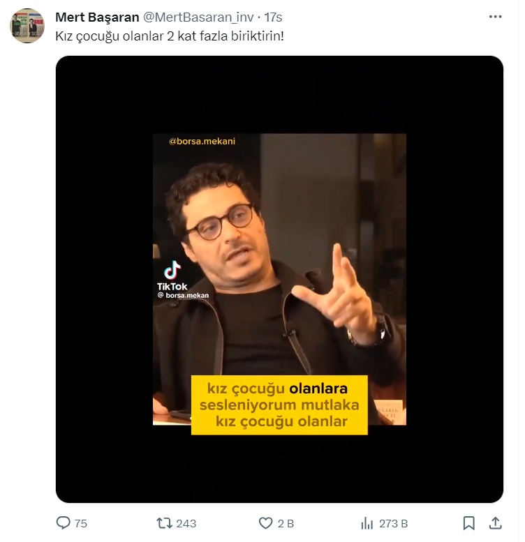 Mert Başaran resmi X hesabı https://twitter.com/MertBasaran_inv üzerinden yaptığı paylaşımda kız çocuğu olanlara seslenerek, "2 kat fazla biriktirin" dedi. Açıklamasında "Kız çocuğu olanlara sesleniyorum, öyle zor bir dünyada yaşıyoruz ki mutlaka bir kere değil iki kere yatırım yapın." diyen Mert Başaran, çocukların geleceği için bireysel emekliliğe hisse senetlerine, topraklara küçük küçük paralar yatırılması tavsiyesini verdi.