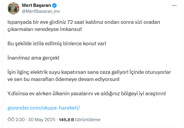 Ekonomist Mert Başaran, sosyal medya hesabı X'ten yurt dışından konut satın almak isteyenleri uyarıyor. Başaran yatırımcılara '' Ülkenin yasalarını ve aldığınız bölgeyi iyi araştırın'' diyerek İspanya örneğini verdi.