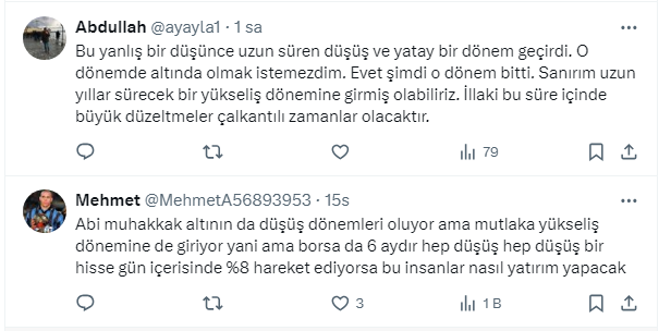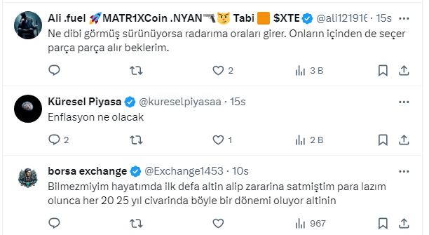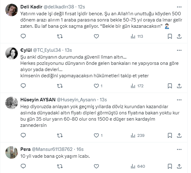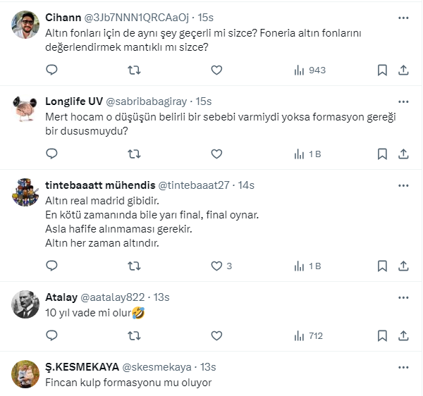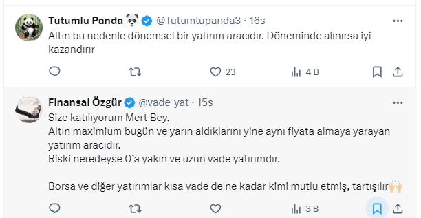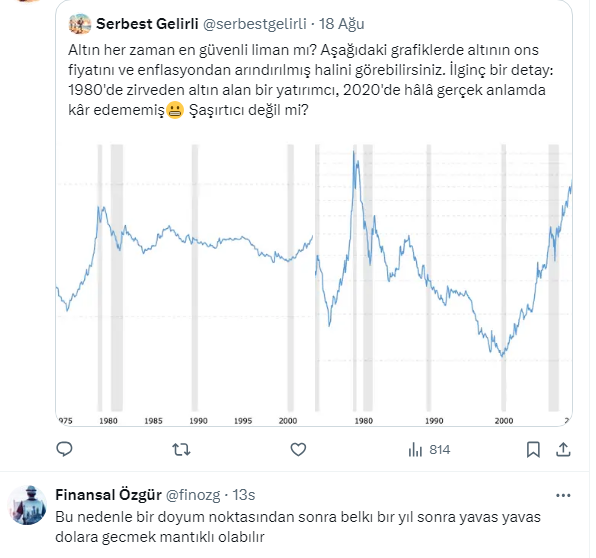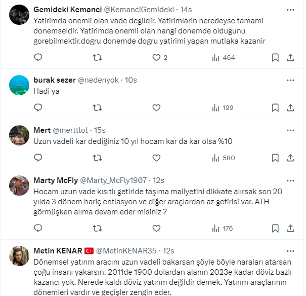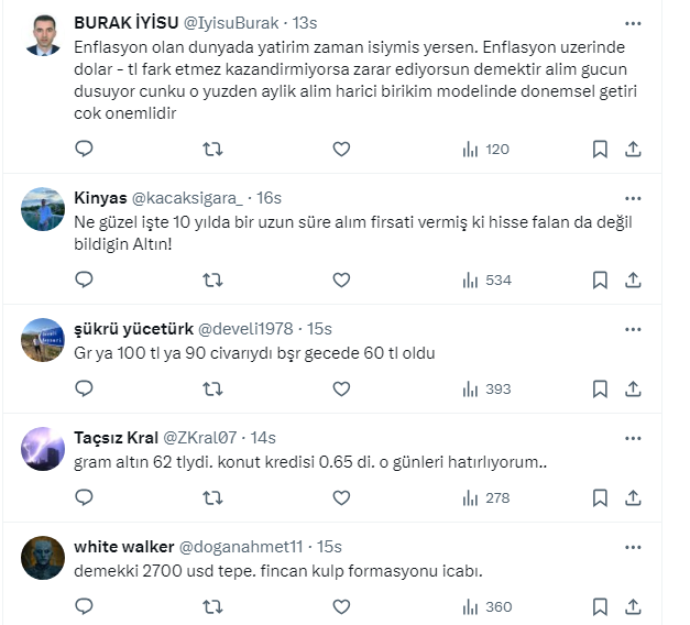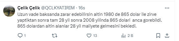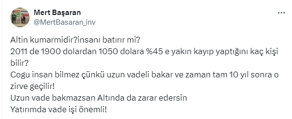 Altın piyasasınd bu gelişmeler yaşanırken ekonomist Mert Başaran https://x.com/MertBasaran_inv X sosyal medya hesasından yaptığı paylaşımda “Altın kumar mıdır? İnsanı batırır mı?” diye sordu. Başaran açıklamasını şöyle sürdürdü: “2011 de 1900 dolardan 1050 dolara yüzde 45 e yakın kayıp yaptığını kaç kişi bilir? Çoğu insan bilmez çünkü uzun vadeli bakar ve zaman tam 10 yıl sonra o zirve geçilir! Uzun vade bakmazsan Altında da zarar edersin Yatırımda vade işi önemli!”