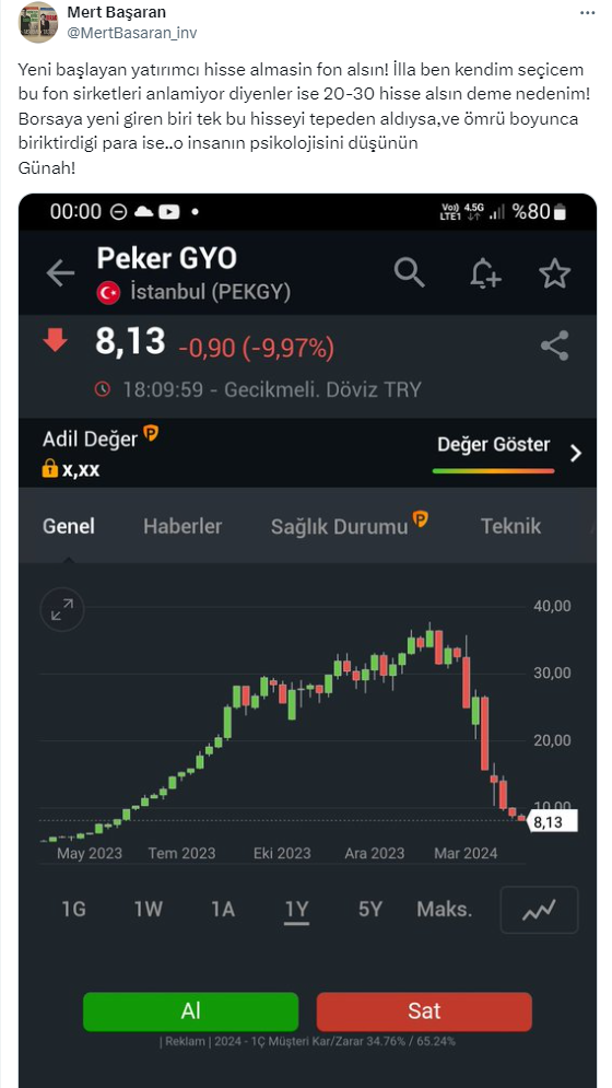 Ekonomist Mert Başaran açıklamasında şu ifadeleri kullandı: "Borsaya yeni giren biri tek bu hisseyi tepeden aldıysa ve ömrü boyunca biriktirdiği para ise o... insanın psikolojisini düşünün. Günah!"