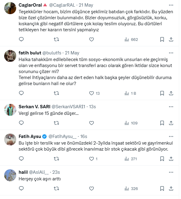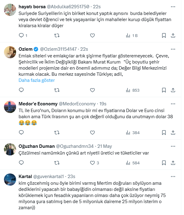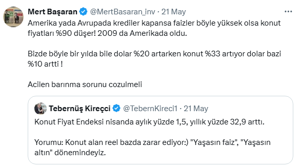 Mert Başaran, Merkez Bankası verilerini değerlendiren Türkiye'nin 1 numaralı emlak ve konut editörü Tebernüş Kireçci'nin sosyal medya paylaşımını alıntılayarak 'Acilen barınma sorunu çözülmeli!' çağrısında bulundu.