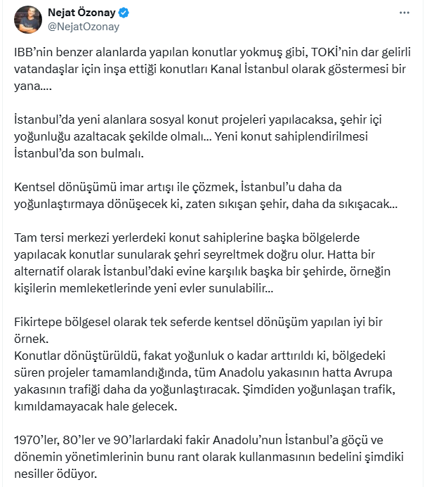 Nejat Özonay, sosyal medya hesabı X'ten, İstanbul'daki kentsel dönüşümü değerlendirerek konut projeleri hakkında açıklamalarda bulundu. İşte o paylaşım...