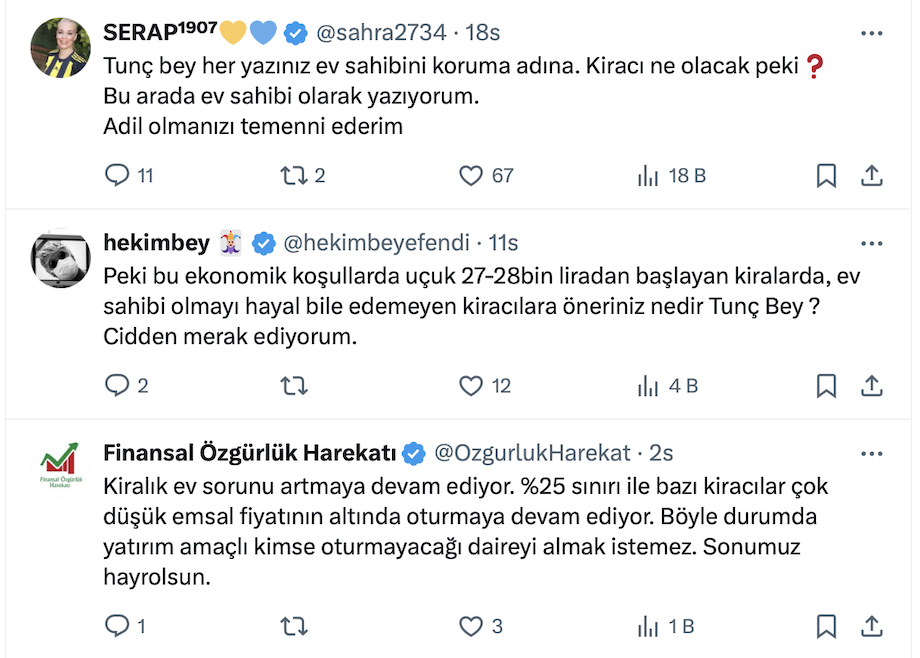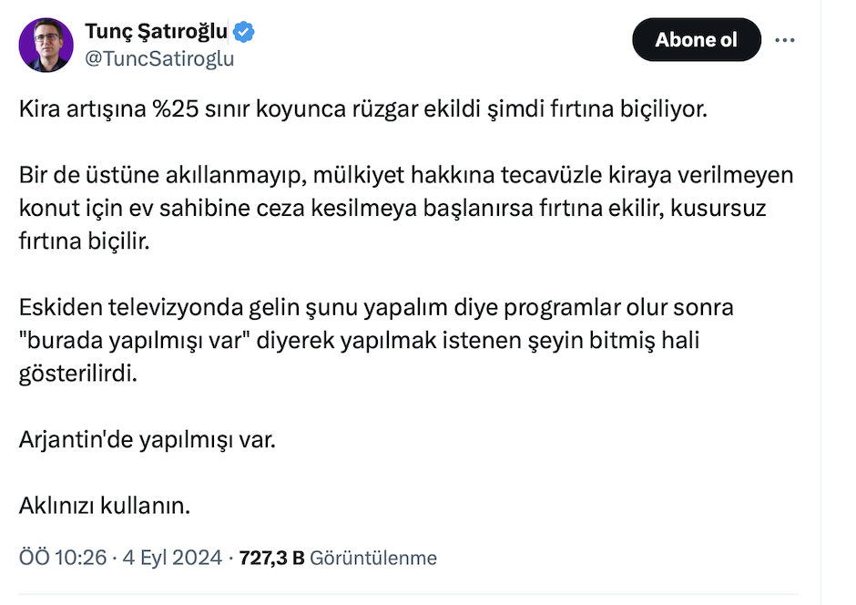 Ev sahibi ve kiracı kavgalarında sular durulmazken, Ekonomist Tunç Şatıroğlu’ndan da çok konuşulacak bir paylaşım geldi. Şatıroğlu, “Kira artışına yüzde 25 sınır koyunca rüzgar ekildi şimdi fırtına biçiliyor” dedi.