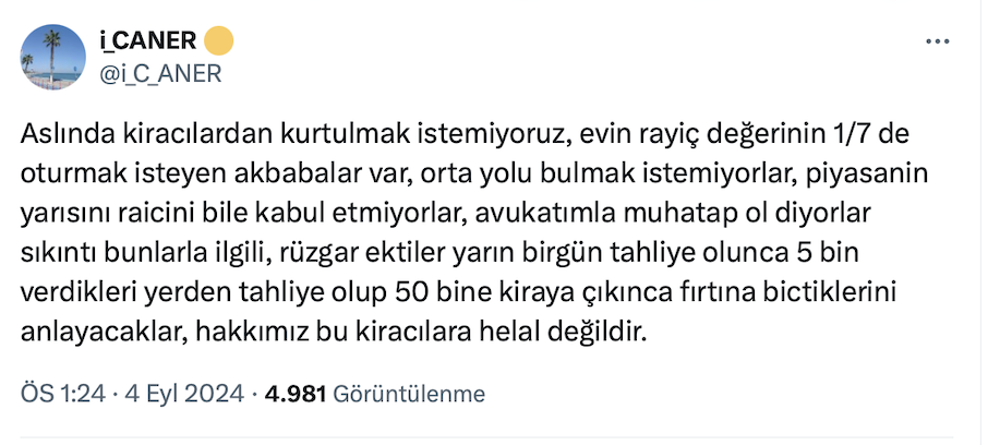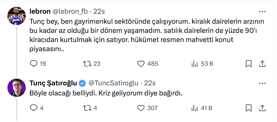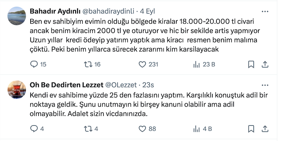 Şatıroğlu paylaşımında, “Kira artışına yüzde 25 sınır koyunca rüzgar ekildi şimdi fırtına biçiliyor” ifadelerini kullandı.