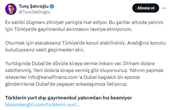 Ekonomist Tunç Şatıroğlu, konut almak isteyenleri sosyal medya hesabından uyardı. Şatıroğlu yatırım için Türkiye'den konut satın alınmamasını tavsiye ederken, sadece oturum amaçlı alınması gerektiğine dikkat çekti.