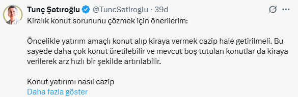 Şatıroğlu, sosyal medya hesabı X'ten kiralık konut sorununun nasıl çözüleceğini tek tek açıkladı. İşte Tunç Şatıroğlu'ndan kiralık konut sorununu çözmek için öneriler...