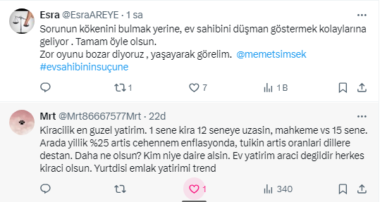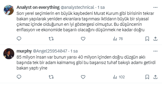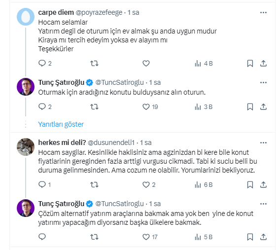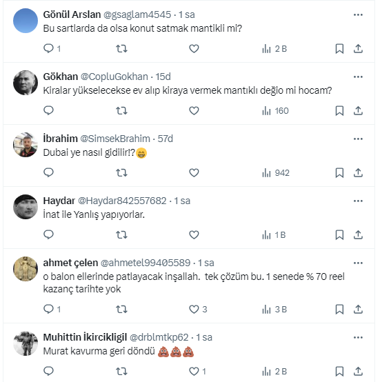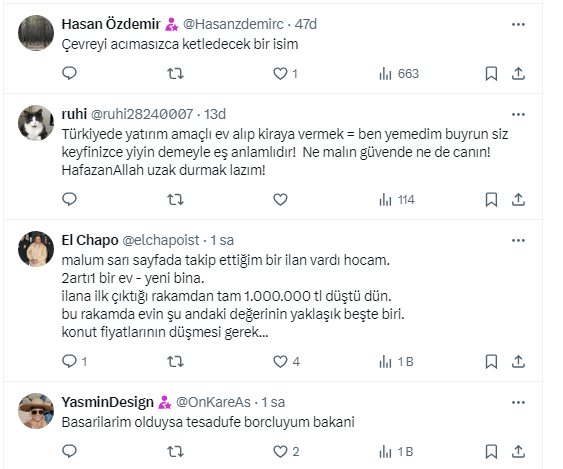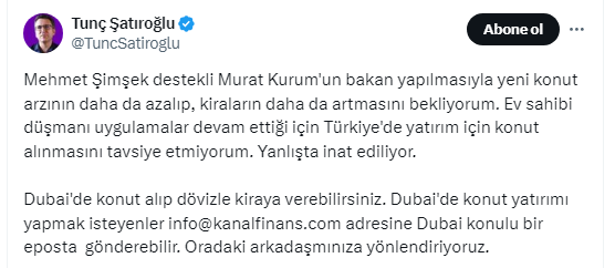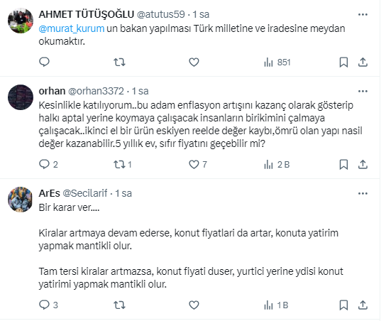 Atama kararlarının ardından ünlü ekonomist Tunç Şatıroğlu, https://x.com/TuncSatiroglu X sosyal medya hesabı üzerinden yaptığı paylaşımda, “Mehmet Şimşek destekli Murat Kurum'un bakan yapılmasıyla yeni konut arzının daha da azalıp, kiraların daha da artmasını bekliyorum. Ev sahibi düşmanı uygulamalar devam ettiği için Türkiye'de yatırım için konut alınmasını tavsiye etmiyorum. Yanlışta inat ediliyor” dedi. Şatırdoğlu takipçilerine Dubai’den ev almalarını tavsiye etti.