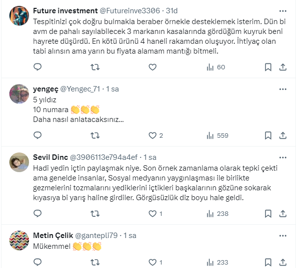 Arkadaşlar, bu fırsatçılık enflasyonundan kurtulmanın tek yolu tüketmemek. Paran varsa bile, sırf kazıklanmamak ya da eşek yerine konmamak için tüketmemek. Bizler, gezip tozup oralarda geçirdiğimiz zamanları fotoğraflayıp, sosyal medyada paylaşmayı ve hava atmayı sevdiğimiz müddetçe bu fırsatçılık enflasyonu bitmeyecek. Bu arada imkanı olanlar tatillerini yurtdışında yapmaya, oralarda yiyip içmeye başladılar. Bu sefer de ülkeden döviz çıkışı olmuş oluyor. Zaten enflasyonu düşürmek için faizlerin arttırılma sebebi de budur. Tüketimi azaltmak. O yüzden pahalılıktan şikayet edeceğimize, abuk sabuk rakamlı adisyonları paylaşacağımıza bir süre gitmeyerek ve tüketmeyerek bu fırsatçılık enflasyonunu düşürebiliriz. Yoksa bu kısır döngü bitmeyecek ve daha çok uzun yıllar dünyanın en pahalı arabalarını, evlerini almaya, dünyanın en pahalı yemeklerini yemeye devam edeceğiz.