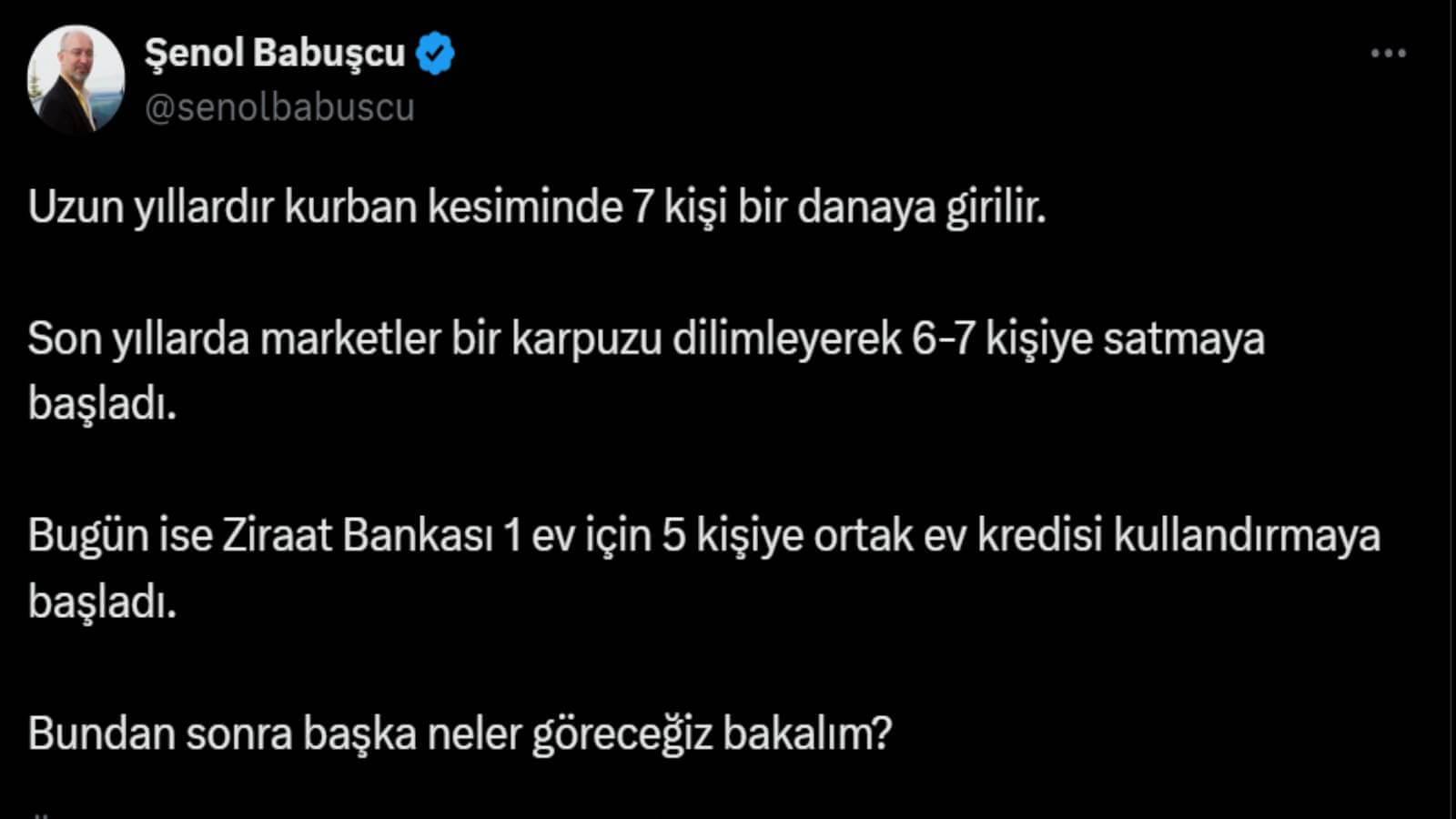 Artan konut fiyatları karşısında Ziraat Bankası’nın açıkladığı 5 kişilik Ortak Konut Kredisi, sosyal medyada gündem oldu. Ekonomist Şenol Babuşçu, haberi danaya girer gibi ortak ev kredisi dönemini diye duyurdu. "Başka neler göreceğiz diyen Babuşçu’nun takipçilerinden ilginç cevaplar gecikmedi.