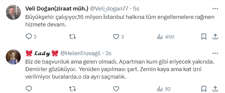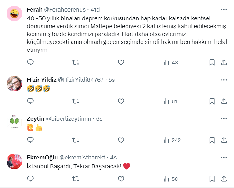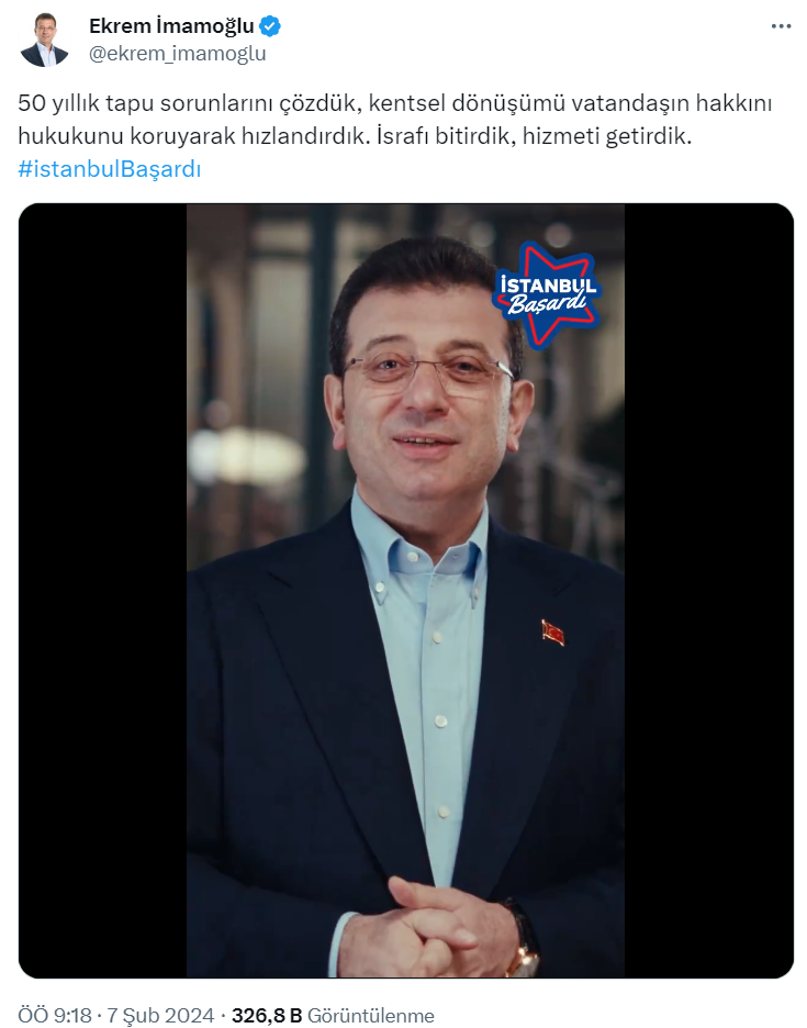 İstanbul Büyükşehir Belediye Başkanı Ekrem İmamoğlu resmi X hesabı https://twitter.com/ekrem_imamoglu üzerinden yaptığı paylaşımda kentteki kentsel dönüşüm çalışmalarına değinerek, "50 yıllık tapu sorunlarını çözdük, kentsel dönüşümü vatandaşın hakkını hukukunu koruyarak hızlandırdık. İsrafı bitirdik, hizmeti getirdik." ifadelerini kullandı.