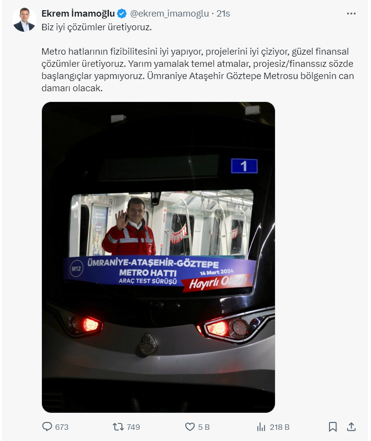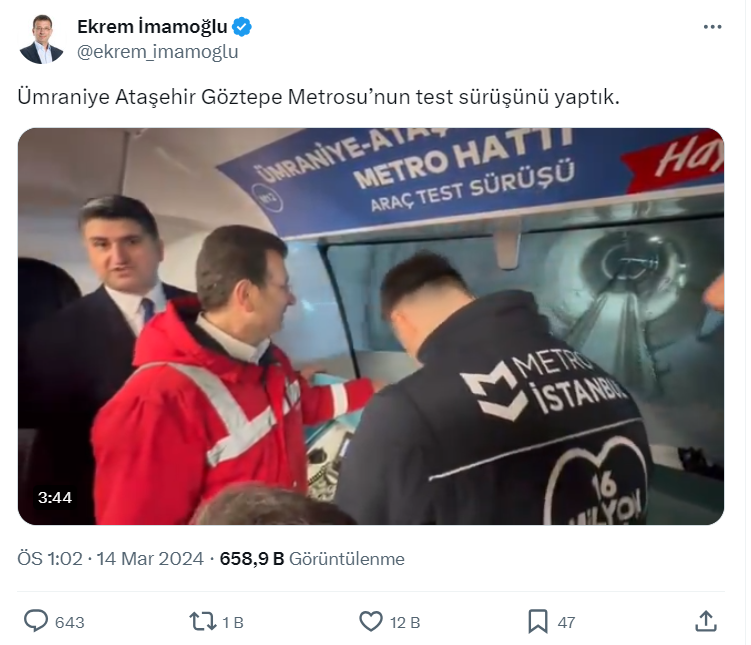İBB Başkanı Ekrem İmamoğlu resmi sosyal medya hesabı https://twitter.com/ekrem_imamoglu üzerinden yaptığı paylaşımda 2017'den bu yana durmuş bir proje olan “Ümraniye-Ataşehir-Göztepe Metro Hattı”nda test sürüşlerinin başladığını duyurdu.