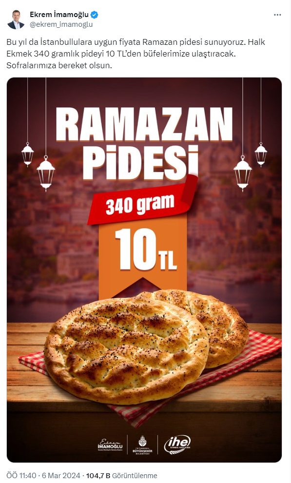 İstanbul Büyükşehir Belediye Başkanı Ekrem İmamoğlu da resmi X hesabı https://twitter.com/ekrem_imamoglu üzerinden yaptığı paylaşımda Halk Ekmek'te satılan Ramazan pidesinin fiyatını açıkladı.