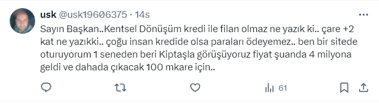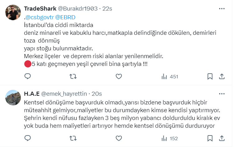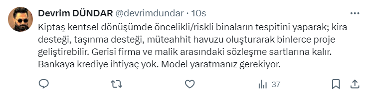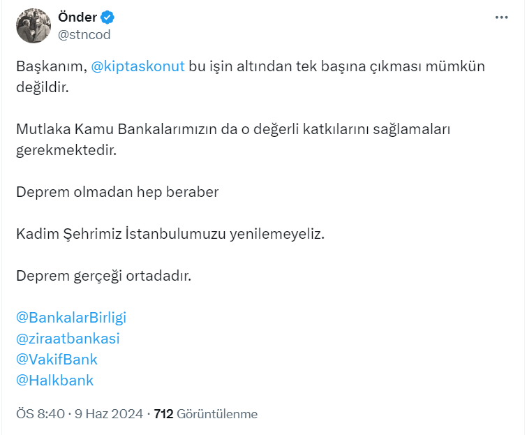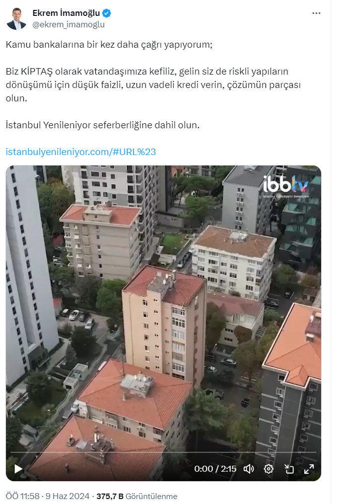 İBB Başkanı Ekrem İmamoğlu resmi X hesabı https://x.com/ekrem_imamoglu üzerinden yaptığı paylaşımda Kamu bankalarına bir kez daha çağrı yapıyorum; Biz KİPTAŞ olarak vatandaşımıza kefiliz, gelin siz de riskli yapıların dönüşümü için düşük faizli, uzun vadeli kredi verin, çözümün parçası olun. İstanbul Yenileniyor seferberliğine dahil olun." ifadelerini kullandı.
