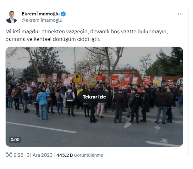 İstanbul Büyükşehir Belediye Başkanı Ekrem İmamoğlu sosyal medya hesabı X'ten TOKİ 100 bin konut kapsamındaki mağdurları paylaşarak '' Milleti mağdur etmekten vazgeçin'' dedi. İşte o paylaşım...