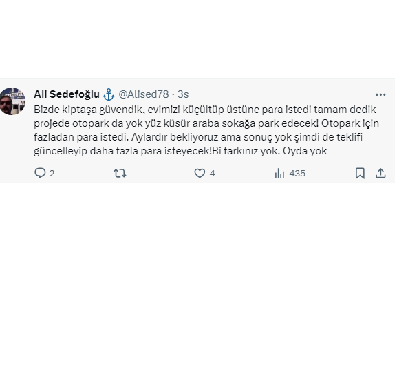 Ali Sedefoğlu@Alised78 ''Bizde kiptaşa güvendik, evimizi küçültüp üstüne para istedi tamam dedik projede otopark da yok yüz küsür araba sokağa park edecek! Otopark için fazladan para istedi. Aylardır bekliyoruz ama sonuç yok şimdi de teklifi güncelleyip daha fazla para isteyecek!Bi farkınız yok. Oyda yok''