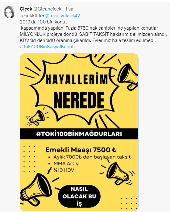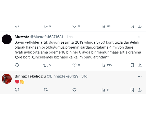 Mustafa @Mustafa16371631: ''Sayın yetkililer artık duyun sesimizi 2019 yılında 5750 kont tuzla dar gelirli olarak haknsahibi olduğumuz projenin şartlari.ortalama 4 milyon daire fiyatı aylık ortalama ödeme 18 bin.her 6 ayda bir memur maaş artış oranina göre borc guncellemeli biz nasıl kalkalım bunu altından?''