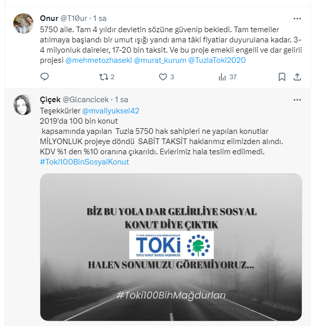 Onur@T10ur: ''5750 aile. Tam 4 yıldır devletin sözüne güvenip bekledi. Tam temeller atılmaya başlandı bir umut ışığı yandı ama tâki fiyatlar duyurulana kadar. 3-4 milyonluk daireler, 17-20 bin taksit. Ve bu proje emekli engelli ve dar gelirli projesi @mehmetozhaseki @murat_kurum @TuzlaToki2020''