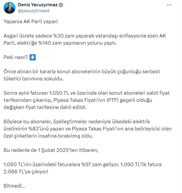 CHP Zonguldak Milletvekili Deniz Yavuzyılmaz'dan elektrik faturalarına yönelik zam iddiası gündeme bomba gibi düştü. Yavuzyılmaz, elektrik faturalarına 1 Şubat'tan itibaren yüzde 140 zam geleceğini iddia ediyor.