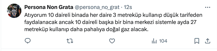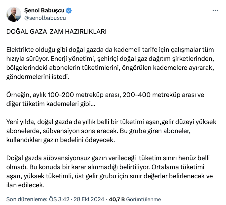 Başkent Üniversitesi Uluslararası Finans ve Bankacılık Bölüm Başkanı Prof. Dr. Şenol Babuşcu resmi sosyal medya hesabı https://x.com/senolbabuscu üzerinden yaptığı paylaşımda doğal gazda kademeli tarife için çalışmalar tüm hızıyla sürdüğünü ve enerji yönetiminin, şehiriçi doğal gaz dağıtım şirketlerinden, bölgelerindeki abonelerin tüketimlerini, öngörülen kademelere ayırarak, göndermelerini istediğini kaydetti.