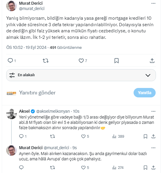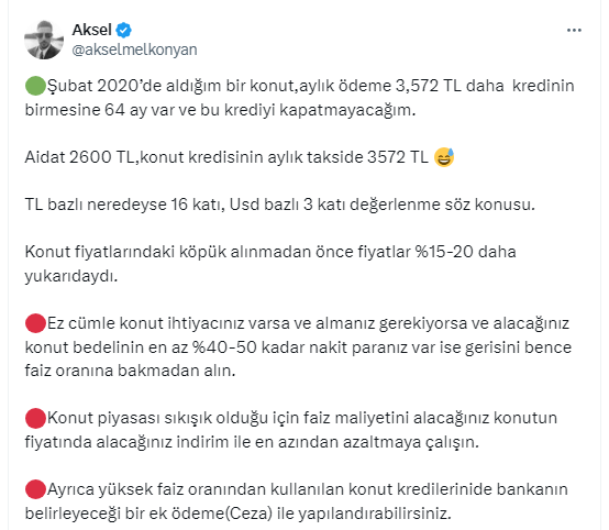 Toprak Yatırımcısı ve Danışmanı Aksel Melkonyan doğru zamanı bekleyenlerle ilgili https://x.com/akselmelkonyan X sosyal medya hesabından bir paylaşım yaptı. 2020’de kredi ile aldığı evi örnek göstererek şu anda aidat ile kredi taksidinin arasında çok az bir fark kaldığına dikkat çeken yatırımcı Melkonyan, 4 yılda TL bazında yaklaşık 16 kat getiri sağladığını belirtti. Melkonyan elinde konut bedelinin yüzde 40-50’si olanların faiz oranına bakmadan evlerini almasını tavsiye etti.