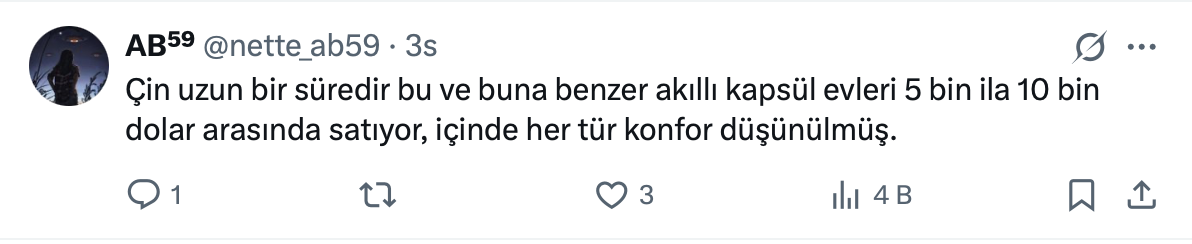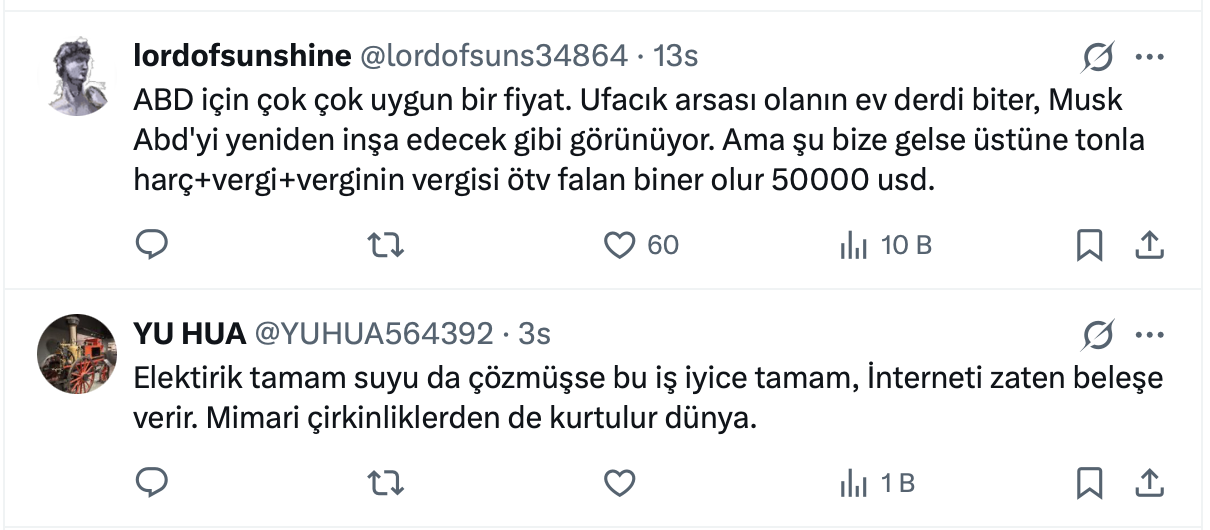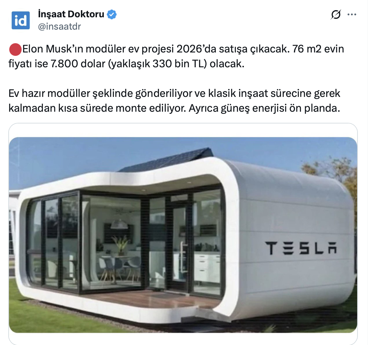 İnşaat Doktoru paylaşımında Elon Musk’ın modüler ev projesinin 2026’da satışa çıkacağını belirterek, 76 metrekare evin fiyatının 7 bin 800 dolar (yaklaşık 330 bin TL) olduğunu belirtti.